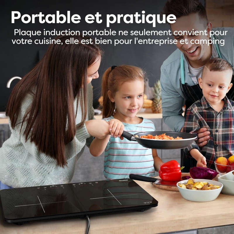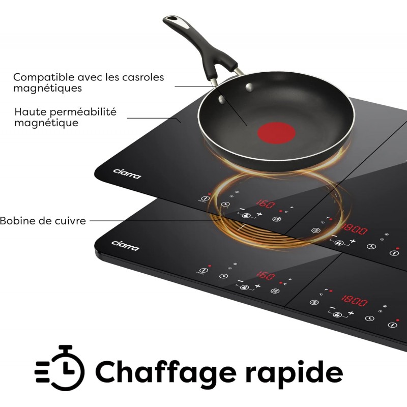 Ultrafino: La placa de inducción doble tiene dos zonas de cocción, que se pueden controlar de forma independiente. Calentamiento rápido por inducción electromagnética para acortar el tiempo de cocción.