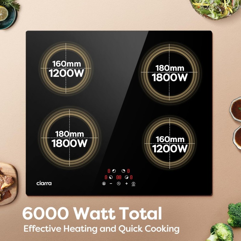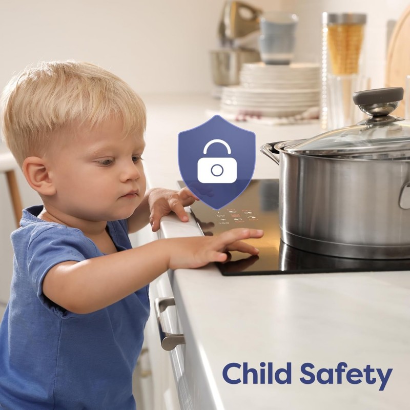 Seguro y fácil de limpiar: la superficie lisa de vitrocerámica es fácil de limpiar y mantiene una apariencia elegante y moderna. Además, las funciones de seguridad integradas, como el bloqueo para niños y la protección contra sobrecalentamiento, garantizan la seguridad de su familia.