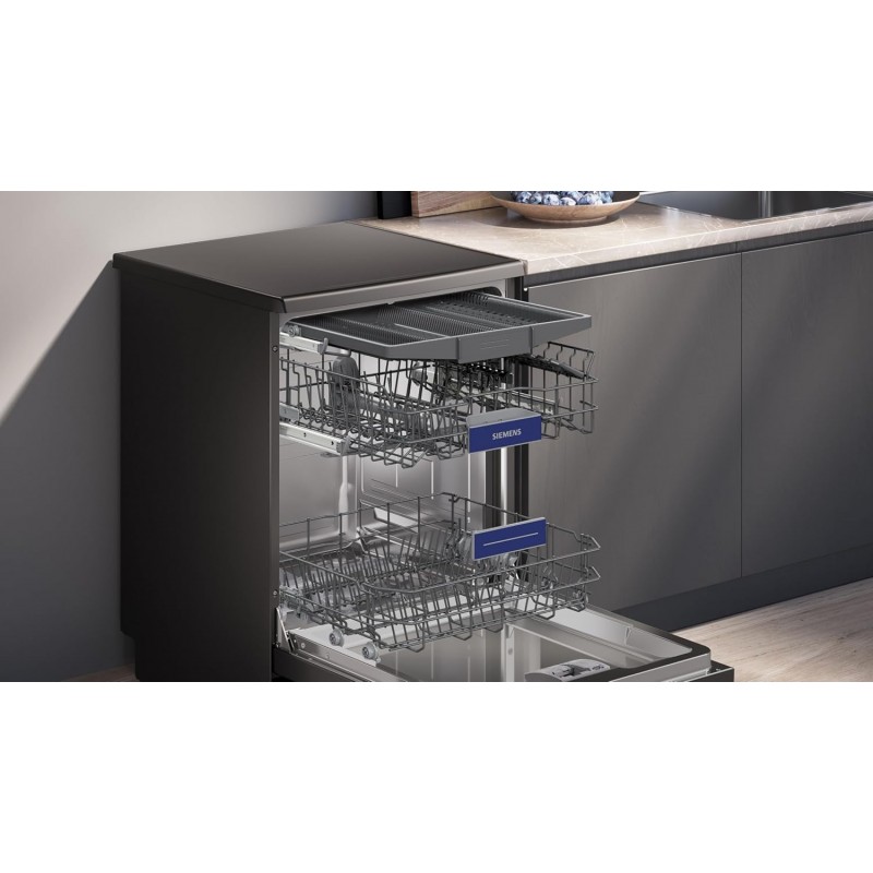 El lavavajillas SIEMENS SN23EC03ME incorpora el motor de inducción iQdrive, que hace que los aparatos sean aún más silenciosos y garantiza una mayor eficiencia energética. De hecho, su imán permanente elimina toda fricción, garantizando así menor desgaste, menos ruido y menor pérdida de energía. Con una capacidad de lavado de 14 cubiertos, este producto ofrece un amplio espacio para acomodar sus platos, vasos y cubiertos, permitiéndole limpiar una gran cantidad de platos de una sola vez. Ofrece 6 programas de lavado y 4 opciones para adaptarse a tus necesidades. Gracias a su función de inicio retardado, podrás programar el lavado para que comience automáticamente a la hora que más te convenga, dándote mayor flexibilidad en la gestión de tu agenda. VarioSpeed Plus acelera el programa de limpieza y deja tu vajilla impecable hasta tres veces más rápido. Esta opción incluso se puede activar durante el ciclo, desde la aplicación Home Connect en tu dispositivo móvil. Para optimizar el almacenamiento de su vajilla, el SN23EC03ME está equipado con cestas varioflex cuyas púas plegables permiten al usuario ajustar el espacio de almacenamiento según el tipo de vajilla a limpiar. Por ejemplo, puedes levantar las púas del cesto superior para insertar copas con tallo alto o las del cesto inferior para guardar una ensaladera. Además dispone de un cajón varioflex dedicado a cubiertos y pequeños utensilios para liberar espacio en el cesto inferior.