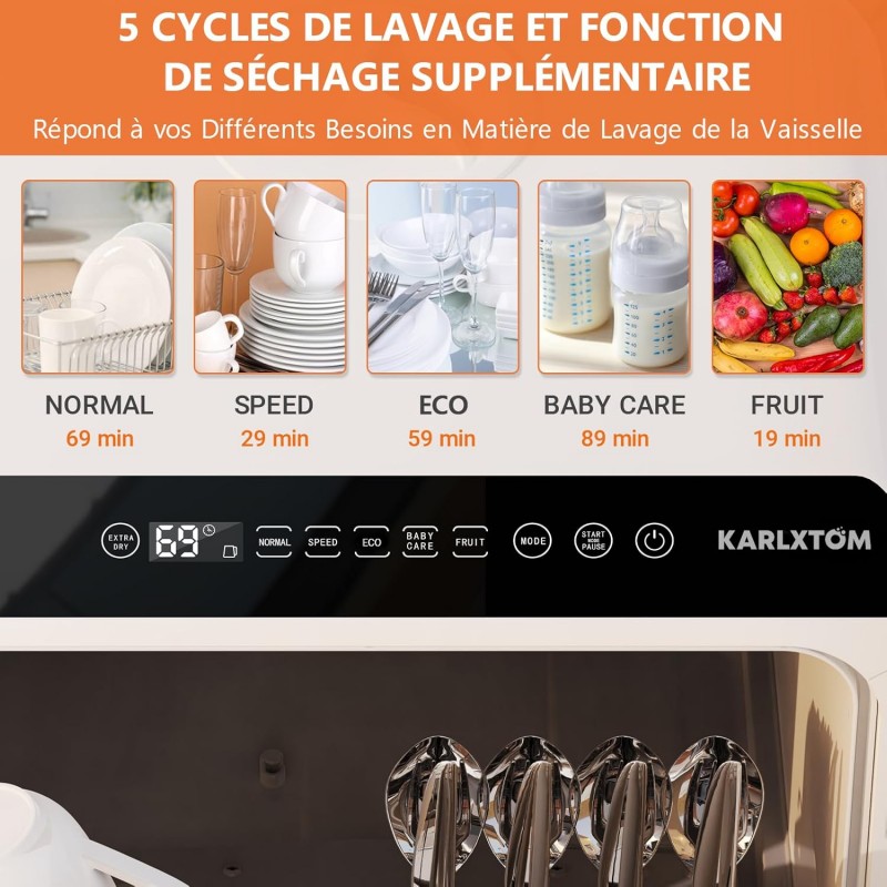 Karlxtom Lave-vaisselle de table, Mini Lave-vaisselle avec Comman destactiles à LED, 45CM, 6 Programmes