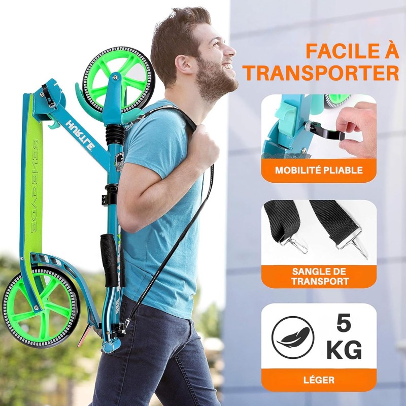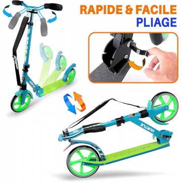 DESIGN PLIABLE : Cette trottinette adolescent dispose d'un mécanisme de pliage gain de place avec des poignées pliables pour un rangement et un transport faciles. De plus, la trottinette est livrée avec une sangle de transport pour une portabilité pratique.
