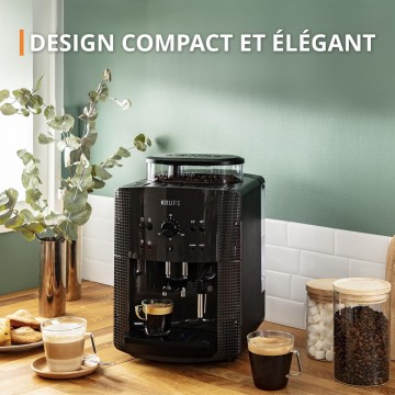 Effortlessly discover the essence of espresso with the KRUPS Essential automatic bean-to-cup coffee machine. This automatic bean-to-cup coffee machine's conveniently compact size, easy-to-use features, advanced technology, and highly intuitive control panel bring the authentic taste of freshly ground coffee and espresso straight to your cup.