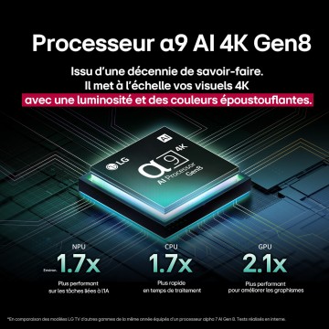 Thanks to its self-emissive pixels , it delivers absolute blacks , infinite contrast , and unparalleled color accuracy , certified 100% true-to-life by Intertek . Its α9 AI 4K Gen8 processor , more powerful than ever, enhances every image in real time , applying intelligent optimizations based on artificial intelligence .