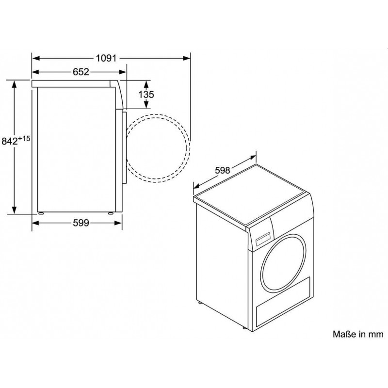 Performance and consumption Nominal capacity for the standard cotton program with full load: 8 kg of cotton laundry Drying type: condensation with heat pump technology Energy efficiency class: A+++ Energy consumption of 176.0 kWh/year based on 160 drying cycles for the standard cotton program with full and partial load as well as the consumption of the low-power operating modes. The actual energy consumption per cycle depends on the type of use of the appliance. Energy consumption of the standard cotton program with full load 1.46 kWh and energy consumption of the standard cotton program with partial load 0.82 kWh Consumption in off-mode 0.1 W and 0.1 W in non-off mode 0.1 W Duration of the non-off state: 30 min The cupboard dry cotton program is the default setting. Drying program to which the information on the label and in the technical data sheet refers. This program is suitable for drying normal damp cotton textiles and is the most energy-efficient program for cotton. Standard cotton program duration with full and partial filling: 117 min. Standard cotton program duration at full filling 148 min and standard cotton program duration at partial filling 94 min. Condensation reduction Efficiency class B on a scale from G (minimum efficiency) to A (maximum efficiency). Average condensation efficiency of the standard cotton program at full filling 87% and average condensation efficiency of the standard cotton program at partial filling 89%. Weighted condensation efficiency of the standard cotton program 88%. Sound power level: 62%. dB (A) re 1. pW programs Special programs: wool finishing, blends, towels, duvets, pillows, warm time program, cold time program, cotton, synthetic, allergy plus/hygiene, sportivePlus, lingerie, super 40, blouses/shirts Anti-crease options 120 min on program detouch Control buttons: already, signal, end time delay, start/pause, drying targets, power Button, drying weight. Fine adjustment, 3 second child lock, 60 min crease protection, 120 min crease protection, 24 h end time delay Comfort and safety SelfCleaning Condenser – No need to clean the condenser AutoDry: moisture-controlled drying programs, program selection with integrated on/off switch, large, clear LED display for displaying the remaining time and 24 h. End time advancement. Program status, additional functions. SoftDry drum system: large stainless steel drum, transducer with soft anti-vibration design: more stability and silence. Interior drum lighting: child safety LED. White plastic door signal.Comfortable closing. Technical information: Device dimensions (H x W x D): 84.2 cm x 59.8 cm x 65.2 cm differential from 85 cm N. Niche height